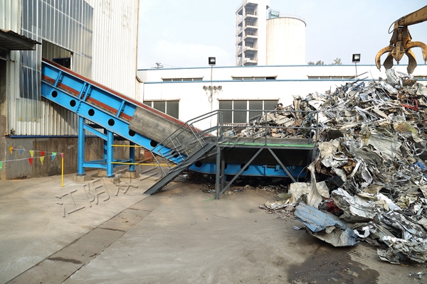 The material is loaded on the scale conveyor by the hydraulic grabbing machine (or electromagnetic chuck) (note that the feeding material must be even), the material is lifted to the double-roller feeder through it, and the material is squeezed by the double-roller to enter the crusher in a suitable size . The crusher is equipped with a water spray port, and the sprayed water can avoid dust and reduce the temperature of the hammer. For large, thick and unbreakable scrap steel, it can be ejected through the discharge door of the crusher. The crushable materials fall into the vibrating conveyor from the grid hole after crushing, and then are sent to the discharge belt conveyor, and then to the magnetic separation system. In the magnetic separation system, the broken steel is sucked up and sent to the stacking conveyor, and other materials fall onto the non-magnetic material conveyor through the hopper at the lower part of the magnetic separation system. The stacking conveyor can move around a fixed axis, and the crushing production line can be stacked in a large fan-shaped area. A suspended magnetic separator is installed above the non-magnetic material conveyor for secondary magnetic separation, which can suck out the remaining magnetic ferrous metal on the non-magnetic material conveyor, reduce the amount of scrap steel missed by the electromagnetic drum of the magnetic separation system, and improve the Recovery rate. The material separated by the non-magnetic material conveyor can be transported to the sorting workshop for the sorting personnel to manually select on it, and the non-ferrous metals such as copper and aluminum caught in the non-magnetic material can be selected to improve the recycling efficiency.
